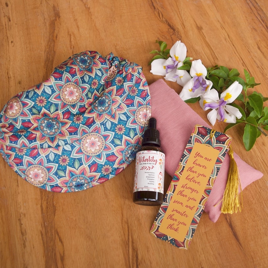 The full coverage cap in our special edition teal print, is soft, stretchy and easy to put on. It has a lovely deep back providing total head coverage and the soft inner lining ensures comfort for a sensitive scalp. The eye pillow will deliver the ultimate in relaxation with the scent of Lavender and Chamomile and it can be heated or cooled down as desired.